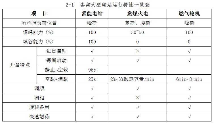 抽水蓄能電站是國內(nèi)外電力系統(tǒng)中應(yīng)用最為廣泛的儲(chǔ)能電站,它具有兩大特性:一是它既是發(fā)電廠,又是用戶,它的填谷作用是其他任何大型發(fā)電站所沒有的,詳見表2-1;二是啟動(dòng)迅速,運(yùn)行靈活、可靠,對負(fù)荷的急劇變化可以快速反應(yīng),除調(diào)峰填谷外,還適合承擔(dān)調(diào)頻、調(diào)相、緊急事故備用、黑啟動(dòng)和系統(tǒng)備用容量等。與其它電源聯(lián)合運(yùn)行時(shí),可提高系統(tǒng)中火電站和核電站等的效率。