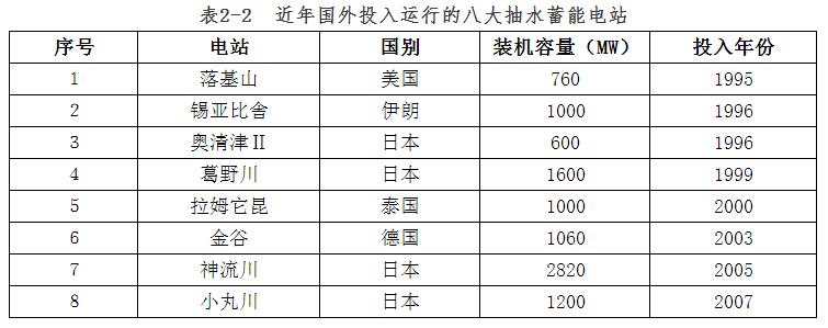 近年國外投入運(yùn)行的八個(gè)大型抽水蓄能電站的情況見表2-2。