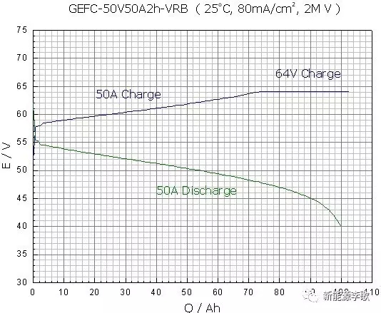 從以上充放電曲線可以看出,該液流電池在充電時(shí)以額定電流50A恒流充電至限壓電壓64V,然后轉(zhuǎn)為恒壓充電;放電時(shí)以額定電流50A放電至截止電壓40V。