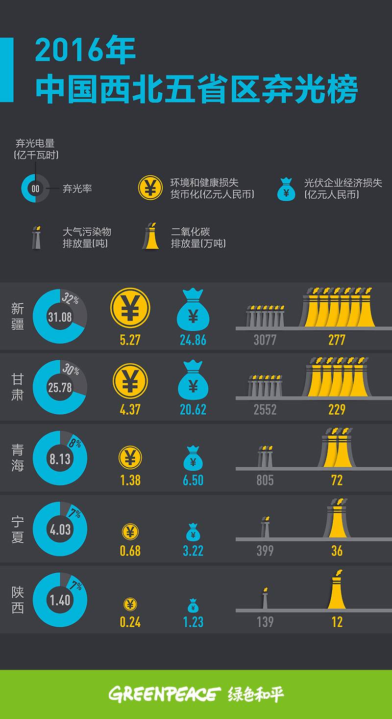 比對中國國家能源局在4月18日所發(fā)表的《2016年度全國可再生能源電力發(fā)展監(jiān)測評價的通報(bào)》,中國全國棄風(fēng)量在2016年高達(dá)497億度,棄光量則達(dá)70.42億度。新疆的棄光率在2016年超越甘肅,前者達(dá)32%、后者達(dá)30%。據(jù)此,綠色和平組織完成了以下的資訊圖表: