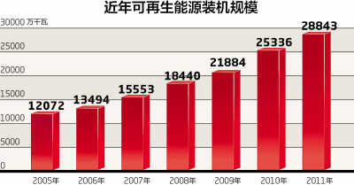 中國儲能網(wǎng)訊:截至2012年10月底,全國6000千瓦以上水電廠裝機容量已達(dá)20632萬千瓦,同比增長6.9%;全國并網(wǎng)風(fēng)電裝機達(dá)到5589萬千瓦,同比增長33.9%。繼本世紀(jì)初我國水電裝機規(guī)模超過美國躍居世界第一之后,2012年我國風(fēng)電裝機也超過美國,升至全球榜首。在以水電、風(fēng)電為主的可再生能源領(lǐng)域,我國發(fā)電裝機規(guī)模雄踞世界第一。