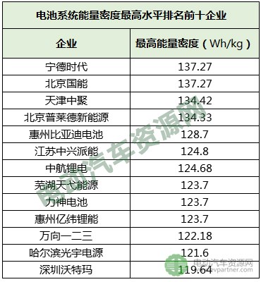 電池系統(tǒng)能量密度最高水平排名前十企業(yè)