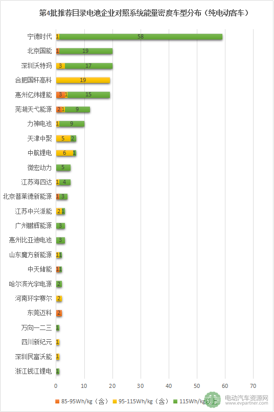 筆者根據(jù)本次217款非快充類純電動客車的電池能量密度,對電池企業(yè)進行如下排名: