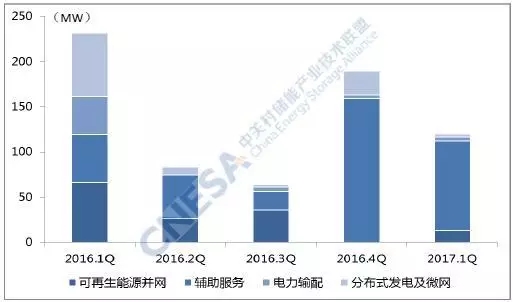 從應(yīng)用分布上看,投運項目在輔助服務(wù)領(lǐng)域的裝機(jī)規(guī)模最大,為99.1MW,同比增長87%,環(huán)比2016年四季度下降38%。
