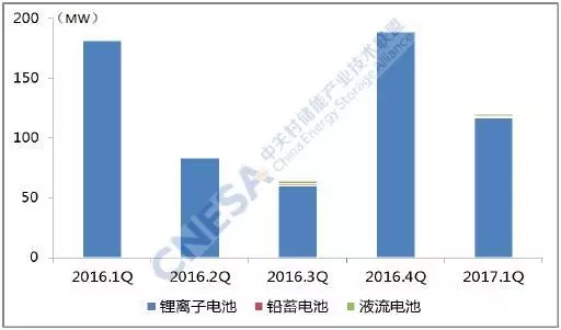 從技術(shù)分布上看,投運項目中,鋰離子電池的裝機(jī)規(guī)模最大,為117.1MW,同比下降35%,環(huán)比2016年四季度下降38%。