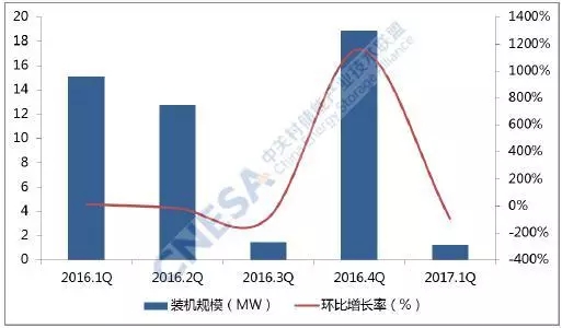 圖4 連續(xù)五個季度新增投運項目的裝機(jī)分布及環(huán)比增長率(中國)