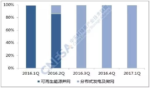 從應(yīng)用分布上看,新增投運項目全部應(yīng)用于分布式發(fā)電及微網(wǎng)領(lǐng)域,該領(lǐng)域同比增長1150%,環(huán)比2016年四季度下降93%。從技術(shù)分布上看,新增投運項目為鋰離子電池和鉛蓄電池項目,二者的裝機(jī)比重分別為40%和60%。