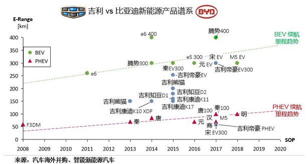 對應其各自的新能源戰(zhàn)略,比亞迪和吉利的產(chǎn)品策略都是以純電動為主動,或以純電動為發(fā)展方向。