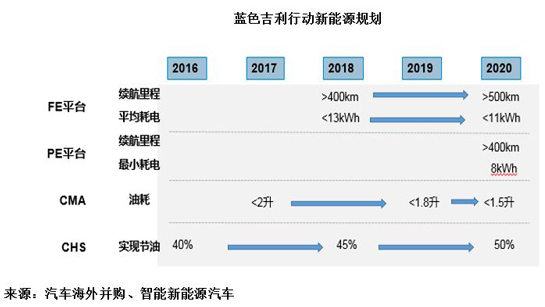吉利的新能源業(yè)務也是脫胎于其傳統(tǒng)汽車背景,也是典型的傳統(tǒng)汽車的打法,即汽油、插電式和純電動并舉,先期以傳統(tǒng)汽油車利潤來補貼新能源車的發(fā)展,之后逐漸加大新能源的投入和產(chǎn)出。根據(jù)吉利的藍色行動新能源規(guī)劃,未來三年中,吉利將重點依托純電動(EV)、插電式混動(PHEV)和油電混動(HEV)三條路線(雖然混動不屬于國家定義的新能源汽車),打造中高端純電動汽車FE平臺、小型專屬純電動汽車PE平臺,以及CMA中級車模塊架構。將提前實現(xiàn)國家第四階段百公里油耗5L的企業(yè)平均燃油限值的目標,當然這一目標的實現(xiàn)寄希望于與科力遠的混合動力系統(tǒng)合資公司。
