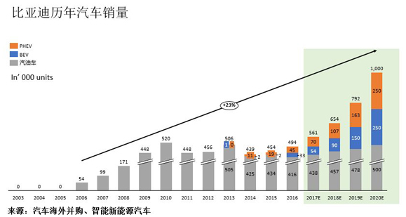 比亞迪自2003年以2.7億元收購陜西秦川77%股份正式進入汽車行業(yè)以來,在產(chǎn)品路徑上堅持典型的傳統(tǒng)汽車打法,即汽油、插電式和純電動并舉,先期以汽油車利潤培養(yǎng)新能源車發(fā)展,之后逐漸加大新能源領域投入,預計到2020年左右,比亞迪的新能源車銷量將超過汽油車銷量。收入方面,2016年比亞迪的新能源汽車收入達到了346億元,占整個汽車業(yè)務的60%左右,可見其新能源業(yè)務收入已經(jīng)超過傳統(tǒng)汽車業(yè)務,并且未來仍有進一步增加的趨勢。