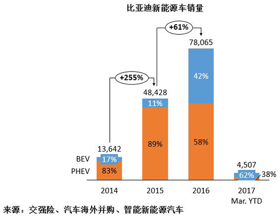 比亞迪新能源車近十年來始終以插電式混合動力為主,但隨著e6、e5和秦EV、宋EV、元EV等一批純電動車陸續(xù)投放市場,其純電動車市場份額增長迅速,新能源汽車銷量中純電動的比重從2014年-2015年的不足20%猛增到2016年的42%,到2017年一季度,純電動車份額已經(jīng)超過插電式混合動力(插電式銷量下滑主要受限于秦插電版在廣東大本營的下滑),達到了62%。