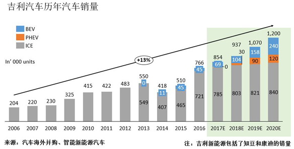 吉利新能源則始終以純電動為主,2013-2015年,主要以“開放”的戰(zhàn)略整合資源,先后與康迪和知豆建立專攻微型電動車的合資公司,生產(chǎn)微型電動車;2015年才推出自己的帝豪EV;2017年上海車展剛剛涉足插電式混合動力,展出了帝豪PHEV。目前吉利新能源的產(chǎn)品結構中,100%是純電動產(chǎn)品。吉利早在2015年發(fā)布的“藍色吉利行動”戰(zhàn)略規(guī)劃中就宣布,到2020年新能源汽車銷量將占公司整體銷量的90%以上。