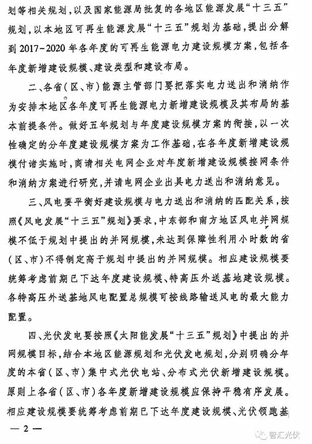 一、各?。▍^(qū)、市)能源主管部門根據(jù)國家發(fā)展改革委、國家能源局發(fā)布的能源發(fā)展“十三五”規(guī)劃、可再生能源發(fā)展“十三五”規(guī) 國家能源局綜合司關(guān)于報(bào)送可再生能源“十三五”發(fā)展規(guī)劃年度建設(shè)規(guī)模方案的通知?jiǎng)澋认嚓P(guān)規(guī)劃,以及國家能源局批復(fù)的各地區(qū)能源發(fā)展“十三五”規(guī)劃,以本地區(qū)可再生能源發(fā)展“十三五”規(guī)劃為基礎(chǔ),提出分解到2017~2020年各年度的可再生能源電力建設(shè)規(guī)模方案,包括各年度新增建設(shè)規(guī)模、建設(shè)類型和建設(shè)布局。