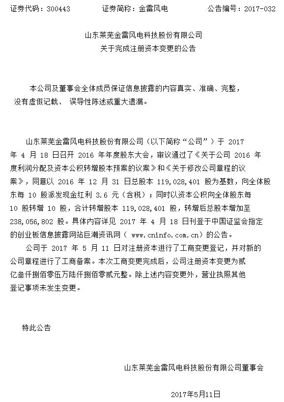 中國儲能網訊:金雷風電昨日對注冊資本進行了工商變更登記,并對新的公司章程進行了工商備案。本次工商變更完成后,金雷風電注冊資本由11903萬元變更為23806萬元,具體為貳億叁仟捌佰零伍萬陸仟捌佰零貳元整(238,056,802元)。以下為具體公告: