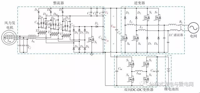 本文提出了一種小型并網(wǎng)風(fēng)力發(fā)電系統(tǒng)并重點(diǎn)分析了其拓?fù)浣Y(jié)構(gòu)。該系統(tǒng)采用具有高電壓增益的反激式倍壓整流電路并引入一條額外的儲(chǔ)能回路。在低風(fēng)速下,利用整流器的升壓作用和零電流開通軟開關(guān)特性,微弱風(fēng)能能夠以相對(duì)較高的效率儲(chǔ)存至電池中;在能量充足條件下,系統(tǒng)的捕獲的風(fēng)能直接傳遞至電網(wǎng),系統(tǒng)的整體效率提高,同時(shí)輸入側(cè)和輸出側(cè)的電流畸變得到抑制。