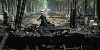 5月2日,經(jīng)濟(jì)觀察報(bào)記者趕往蟹島時(shí),火災(zāi)現(xiàn)場(chǎng)已經(jīng)被嚴(yán)密封鎖。根據(jù)附近多位居民的說(shuō)法,5月1日的火災(zāi)很?chē)?yán)重,幾公里外可以看見(jiàn)數(shù)十米高沖天的黑煙,中間還伴隨著巨大的爆炸聲,雖然大火在兩個(gè)小時(shí)內(nèi)得到控制,但是消防車(chē)輛直至下午4點(diǎn)還在不斷灑水。從一些目擊者拍攝的現(xiàn)場(chǎng)視頻資料來(lái)看,火勢(shì)幾乎在幾分鐘內(nèi)就變得不可控制,近三十輛車(chē)很快被燒得只剩下車(chē)架。
