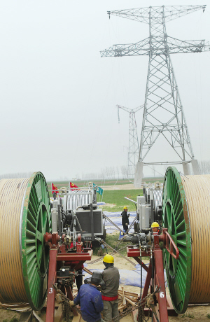 本次架線施工從3月18日開始,施工現(xiàn)場位于黃河灘地,風(fēng)沙較大。為了保證導(dǎo)線安全穩(wěn)定地跨越黃河,架線使用的導(dǎo)線具有截面大、張力大、比重大等技術(shù)特點(diǎn),其鋼芯截面積為240平方毫米,是特高壓工程常用的1000平方毫米導(dǎo)線鋼芯截面積的3倍,導(dǎo)線比重為4.373千克/米,單根導(dǎo)線展放張力約為8.6噸。為了適應(yīng)導(dǎo)線特性,河南送變電工程公司專門為本次工程設(shè)計(jì)制造了目前國內(nèi)最大噸位的張力機(jī),還專門研制了大噸位地錨、放線架、卡線器等一系列配套的施工工器具,為本次黃河大跨越標(biāo)段架線施工順利進(jìn)行提供了強(qiáng)有力的技術(shù)支撐。