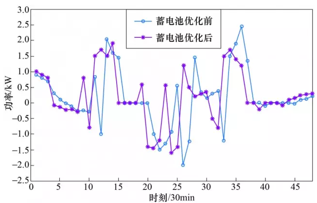 對(duì)比風(fēng)光出力以及核心負(fù)荷運(yùn)行的時(shí)間段,從計(jì)算結(jié)果可以看出:溫控負(fù)荷的運(yùn)行集中在風(fēng)光出力較為充足的時(shí)段或者電價(jià)處于谷時(shí)段和平時(shí)段,但是由于用戶對(duì)負(fù)荷有舒適度的要求,如熱水器和空調(diào),在晚上18:00至22:00之間用電高峰時(shí)段也需要有適當(dāng)集中的運(yùn)行時(shí)間??赊D(zhuǎn)移負(fù)荷中的洗衣機(jī)設(shè)備在優(yōu)化后,運(yùn)行時(shí)間被轉(zhuǎn)移到電價(jià)最為低廉的清晨,且這時(shí)候風(fēng)力發(fā)電相對(duì)充足,符合能量管理策略最初的設(shè)計(jì)期望,對(duì)于電飯鍋的運(yùn)行時(shí)段,也是符合日常生活規(guī)律的,且在一定程度上提前或延遲其運(yùn)行時(shí)段,達(dá)到了優(yōu)化的要求。由圖6可以看出,在負(fù)荷需求量較大的時(shí)段18:00至22:00、14:00至16:00處于負(fù)荷用電高峰時(shí)段,且此時(shí)的電價(jià)也處于峰值階段,蓄電池放電較多,而在負(fù)荷需求量較小的上午且電價(jià)處于谷值時(shí),蓄電池得以充電。并且可以看出優(yōu)化后的蓄電池充放電深度明顯小于優(yōu)化前的充放電深度,因此可以適當(dāng)降低蓄電池的配置容量,從而符合虛擬儲(chǔ)能的優(yōu)化目標(biāo)。