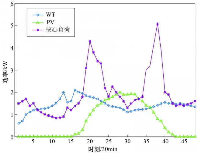 算例中,取光伏電池的容量2.3kW,風(fēng)機(jī)容量為2.5kW,蓄電池容量為5kW,蓄電池的放電價(jià)格為0.4元/kWh,對(duì)于蓄電池的荷電狀態(tài),參照市面上普遍標(biāo)準(zhǔn),取SOCmin=20%,SOCmax=90%;分時(shí)電價(jià)的定義、可控負(fù)荷的具體參數(shù)、溫控負(fù)荷的溫度限值和風(fēng)光出力數(shù)據(jù)見表1、表2、表3和圖3。