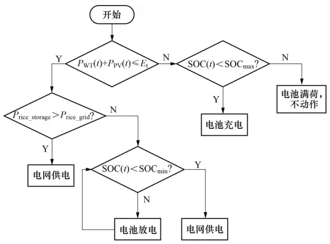 由圖2可知,在微電網(wǎng)系統(tǒng)并網(wǎng)運(yùn)行的情況下,為了提高風(fēng)光利用率,需要先判斷風(fēng)光出力能否滿足所有負(fù)荷的需求,如果能夠滿足,再判斷蓄電池的荷電狀態(tài),假如此時(shí)蓄電池高于最小荷電狀態(tài)卻低于最高荷電量,蓄電池則工作在充電狀態(tài),否則,蓄電池的荷電量處于最高狀態(tài),無需動(dòng)作,保持當(dāng)前狀態(tài)即可;如果風(fēng)光出力不能滿足當(dāng)前所有負(fù)荷的需求,此時(shí),需要判斷蓄電池的放電價(jià)格和當(dāng)前分時(shí)電價(jià)孰高孰低,若蓄電池放電價(jià)格較高,則風(fēng)光出力不能滿足負(fù)荷所需電量的部分需要電網(wǎng)提供,反之,若當(dāng)前電價(jià)較高,則判斷蓄電池當(dāng)前的荷電量,如果荷電量大于最小荷電狀態(tài),則需要蓄電池放電以補(bǔ)充風(fēng)光出力不足的部分,如果蓄電池的荷電量不足以維持,則采用電網(wǎng)供電。
