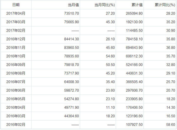 以下為2016年2月至2017年4月我國鋰離子電池產(chǎn)量。