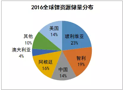 據(jù)美國地質(zhì)調(diào)查局2016年最新統(tǒng)計(jì),世界已查明的鋰資源量約4099萬噸,儲(chǔ)量約1400萬噸。從分布來看,主要分布在南美洲和亞洲(約70%),重要富集地為南美洲“鋰三角”(玻利維亞、阿根廷、智利)。