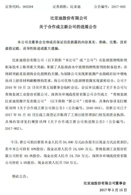 比亞迪和吸附法的廠家藍(lán)科鋰業(yè)開展新一輪的合作,2016年10月29日動(dòng)工年產(chǎn)3萬噸電池級(jí)碳酸鋰生產(chǎn)線。