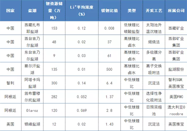 西藏礦業(yè)、西部礦業(yè)集團(tuán)、鹽湖股份、SQM、FMC和美國雅寶等公司掌握著全球著名的鹽湖,不同鹽湖,鎂鋰比值也有很大的差別,運(yùn)用的開采工藝也會(huì)“因湖而異”。下表是全球已開發(fā)的著名鹽湖提鋰技術(shù)。