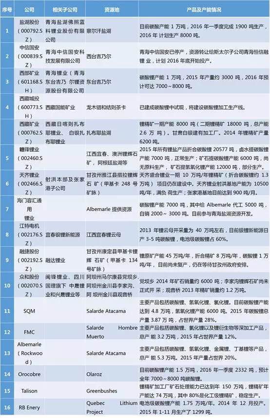 國內(nèi)外鋰業(yè)公司產(chǎn)能情況(截止2016年3月)