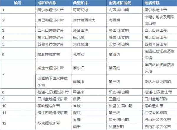 我國鋰礦成礦條件優(yōu)越,根據(jù)鋰礦成礦條件和成礦規(guī)律,全國劃分出松潘-甘孜、阿爾泰、藏北、柴達(dá)木等12個(gè)鋰礦成礦區(qū)帶。