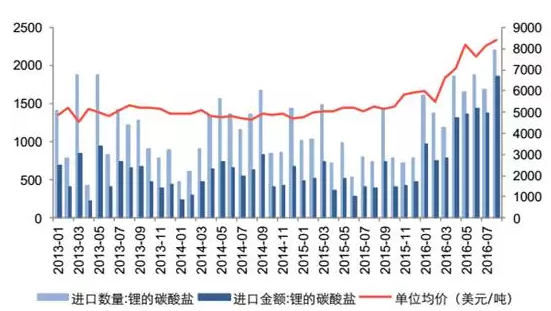 全球碳酸鋰需求量持續(xù)增長,進(jìn)口碳酸鋰單價(jià)持續(xù)上漲。從2016年的1月份到3月份,短短3個(gè)月,國內(nèi)碳酸鋰從4萬漲到了十七八萬。