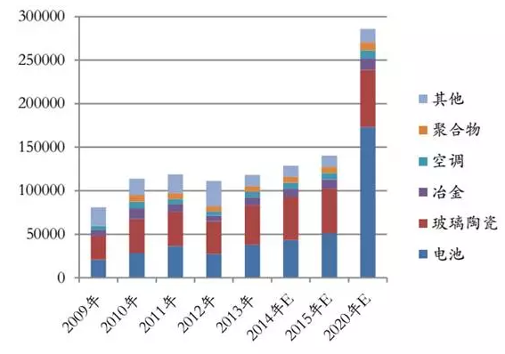 在電動(dòng)汽車的推動(dòng)下,從2009-2015年,鋰用于電池的份額逐漸增大。預(yù)期達(dá)到2020年,電池將會(huì)超越玻璃陶瓷,占鋰終端消費(fèi)的最大份額。
