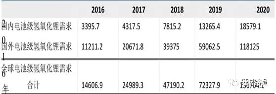 2016-2020年動力鋰電池氫氧化鋰需求測算
