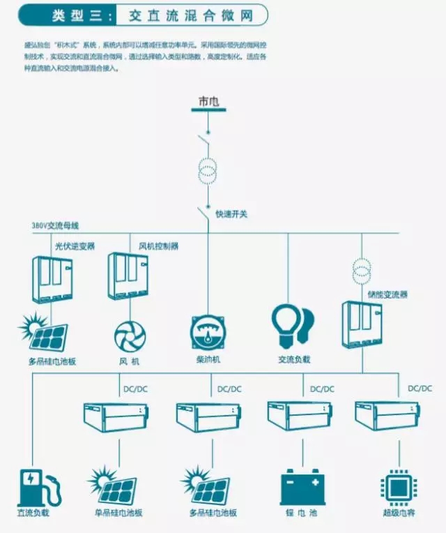 自2012年以來,盛弘電氣儲能PCS已積累了多個(gè)微電網(wǎng)項(xiàng)目應(yīng)用經(jīng)驗(yàn),并形成了針對不同類型微電網(wǎng)的解決方案,包括交流微電網(wǎng)、直流微電網(wǎng)及交直流混合微電網(wǎng)。這種解決方案上的廣泛覆蓋性首先源于產(chǎn)品模塊化設(shè)計(jì)所帶來的靈活性,就像搭建積木一樣,針對儲能項(xiàng)目的具體需求,僅通過內(nèi)部功率模塊的增減,盛弘電氣PCS就能適配幾乎所有應(yīng)用場景。