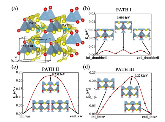 圖2計算得到的Pmc21-LiAlSO的動力學性質。(a)通過BVpath程序計算得到的LiAlSO中的鋰離子輸運通道以及由密度泛函方法計算得到(b)Li+沿a方向由間隙離子與晶格位離子協(xié)同運動的遷移勢壘,(c)Li+沿a軸方向空位遷移的勢壘,(d)Li+沿c方向間隙離子遷移的勢壘。