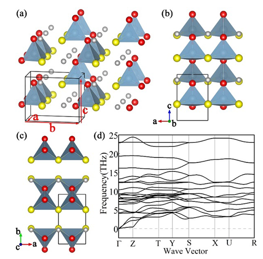 圖1通過計算預測得到的(a)Pmc21空間群LiAlSO的晶體結構,沿(b)b-軸和(c)c-軸的視圖以及(d)計算得到的聲子譜?;疑?、黃色和紅色的圓球分別代表Li,S和O原子。四面體代表AlS2O2單元。