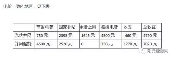 舉個(gè)例子來說,在南方一套5KW光伏發(fā)電系統(tǒng),每年發(fā)電約6000度,每年會(huì)停電120小時(shí)左右,約損失300度電。自用電電價(jià)是0.75元/度,大部分在晚上,光伏發(fā)電余量上網(wǎng),除去稅電價(jià)約0.35元/度,兩者每度電有0.4元的價(jià)差。用戶每年用電約7000度,如果沒有安裝光伏發(fā)電,每年需要繳付5250元的電費(fèi);安裝光伏后,國(guó)家補(bǔ)貼0.42元/度,白天光伏用電很少,大部分都是余量上網(wǎng)賣給電網(wǎng),晚上用電還是需要繳付電費(fèi);安裝光伏儲(chǔ)能系統(tǒng)后,在停電期間也可以正常發(fā)電,每年6000度全部自發(fā)自用,可節(jié)省電費(fèi)4500元,我們來對(duì)比一下兩種方案客戶的收益: