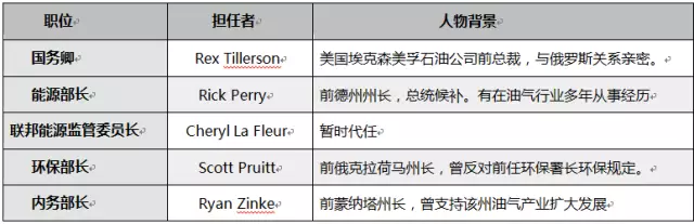 特朗普政府的能源環(huán)保政府機構(gòu)的要職人物多是石油天然氣傳統(tǒng)化石能源有著從事多年的豐富經(jīng)驗。未來美國本國石油天然氣產(chǎn)業(yè)會得到大力的政策支持,而針對碳減排環(huán)保的政策會有所放寬。