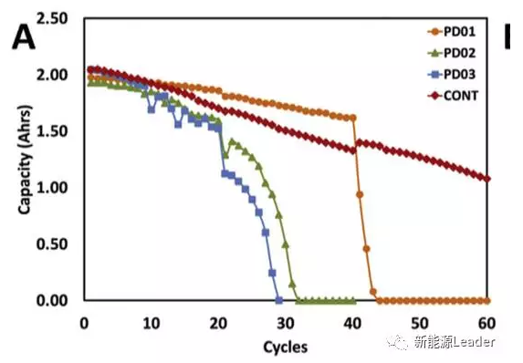 測試中YangGao采用了商用18650電池,正極材料為LiCoO2,負(fù)極材料為石墨,測試了不同的充電電流對電池衰降速率的影響,結(jié)果如下圖所示。從下圖a中我們可以看到,充電電流對于鋰離子電池衰降速度具有極大的影響,在0.5C充電倍率下,在前150次循環(huán)電池的衰降速度為0.020%/循環(huán),在150次-800次則穩(wěn)定為0.0156%/循環(huán),800次以后為0.0214%/循環(huán)。而0.8C充電倍率下,電池在前150次,衰降速度為0.0243%/循環(huán),150次-800次為0.175%/循環(huán),800次以后為0.0209%/循環(huán)。對于1C倍率充電,前150次衰降速率為0.032%/循環(huán),150次-600次衰降速率為0.0188%/循環(huán),600次以后衰降速度為0.0271%/循環(huán)。1.2C充電,前100次衰降速度為0.0472%/循環(huán),100次-400次衰阿醬速度為0.0226%/循環(huán),400次以后衰降速度為0.0356%/循環(huán)。1.5C倍率充電與其他倍率充電的電池具有很大的不同,平均衰減速度為0.078%/循環(huán),遠(yuǎn)遠(yuǎn)快于其他倍率下充電的電池。從上述數(shù)據(jù)可以看到,隨著充電的倍率的加大,鋰離子電池的衰降速率也在快速增加,并且從曲線的斜率來看,電池的衰降速度存在三個(gè)不同的階段,前期衰降速度較快的階段(階段1),中間衰降速度較慢的穩(wěn)定階段(階段2),和后期的衰降速率加速階段(階段3)。針對三個(gè)階段電池的衰降機(jī)理的研究認(rèn)為,階段1可能是因?yàn)殡姵豐EI膜生長需要消耗一部分Li+,因此衰降速度較快。在階段2隨著SEI膜結(jié)構(gòu)的穩(wěn)定,內(nèi)部較為穩(wěn)定,因此衰降速度較慢,在階段3隨著電池老化,開始發(fā)生活性物質(zhì)損失,電極活性界面減少,導(dǎo)致電池對于電流十分敏感。圖C是針對不同的截止電壓對電池衰降速度影響的實(shí)驗(yàn),從實(shí)驗(yàn)結(jié)果可以看到,當(dāng)把充電截止電壓提高到4.3V時(shí)會導(dǎo)致電池的循環(huán)性能急劇惡化,降低充電截止電壓可以有效的改善電池的循環(huán)性能。