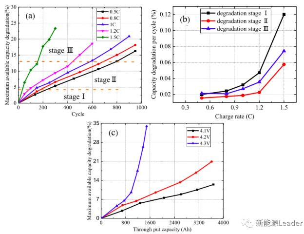 鋰離子電池的放電制度很大程度上依賴于使用者,好的放電制度對于有的使用者而言并不一定適用。但是充電制度則主要是設(shè)計(jì)者進(jìn)行控制,因此對于充電制度對電池壽命衰降的影響的研究,能夠更好的指導(dǎo)我們對鋰離子電池的設(shè)計(jì)。北京交通大學(xué)的YangGao等[3]針對不同的充電制度對鋰離子電池壽命衰降的影響,并研究了其作用機(jī)理,提出了鋰離子電池的壽命衰降模型。YangGao的研究顯示,當(dāng)充電電流和截止電壓超過一定的數(shù)值時(shí),鋰離子電池的衰降將被極大的加速,為了降低鋰離子電池的衰降速率,需要針對不同的體系,選擇合適的充放電電流和截止電壓。