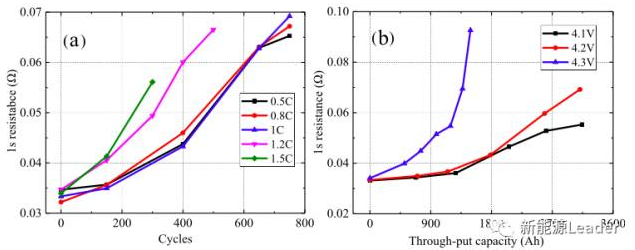 對電池的動態(tài)內(nèi)阻分析如下圖所示,從圖a測試結(jié)果來看,當(dāng)充電電流小于1C時(shí),電池動態(tài)內(nèi)阻隨著電池循環(huán)的變化趨勢幾乎時(shí)一樣的,但是當(dāng)充電電流超過1C時(shí),電池動態(tài)內(nèi)阻增加速度會隨著充電速率的增加而快速增加。從圖b的測試結(jié)果來看,當(dāng)充電截止電壓為4.3V時(shí),電池動態(tài)內(nèi)阻增加非常迅速表明高截止電壓會惡化電池的動力學(xué)條件,截止電壓為4.1V和4.2V時(shí)電池動態(tài)內(nèi)阻增加較為緩慢。