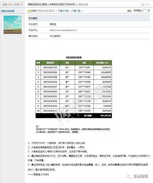 中國儲(chǔ)能網(wǎng)訊:6月6日,綠能寶臨時(shí)負(fù)責(zé)人毛毅峰在網(wǎng)貸天眼貼吧發(fā)表帖子稱,綠能寶在6月5日又兌付了約40萬,并且公布了6月5日的兌付名單。