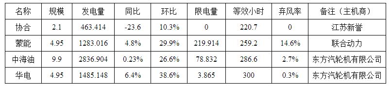 2017年5月份,我市風(fēng)電發(fā)電量6068.482萬千瓦時,同比增長0.19%,環(huán)比增長28.56%,限發(fā)電量302.611萬千瓦時,綜合棄風(fēng)率約為4.7%,等效發(fā)電小時約277.1小時。其中,長風(fēng)協(xié)合2.1萬千瓦風(fēng)電場發(fā)電量為463.414萬千瓦時,無限發(fā)電量,等效發(fā)電小時約220.7小時。蒙能新能源4.95萬千瓦風(fēng)電場發(fā)電量為1283.016萬千瓦時,限發(fā)電量219.914萬千瓦時,等效發(fā)電小時約259.2小時。中海油9.9萬千瓦風(fēng)電場發(fā)電量為2836.904萬千瓦時,限發(fā)電量78.832萬千瓦時,等效發(fā)電小時約286.6小時。華電風(fēng)光互補4.95萬千瓦風(fēng)電場發(fā)電量為1485.148萬千瓦時,限發(fā)電量3.865萬千瓦時,等效發(fā)電小時約300小時,為我市風(fēng)力發(fā)電等效發(fā)電小時數(shù)最高。