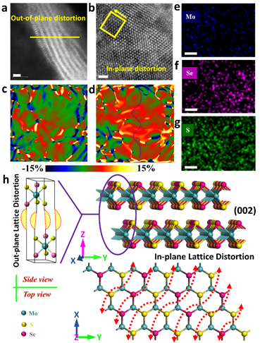 溫兆銀團隊在前期成功合成定向結(jié)構(gòu)三維二硫化鉬材料的基礎(chǔ)上(ACS Nano, 2015, 9 (12), 12464-12472. DOI:10.1021/acsnano.5b05891),采用低溫液相法成功地設(shè)計了層內(nèi)二硫化鉬/二硒化鉬異質(zhì)結(jié)構(gòu),通過與美國伊利諾伊斯大學(xué)合作進行的球差校正掃描透射電鏡分析證明了該層狀材料層間和層內(nèi)高度的晶格畸變,且沿相同晶面呈現(xiàn)間距不規(guī)則的特性,這種高度畸變的亞穩(wěn)結(jié)構(gòu)能夠顯著提升材料的催化活性。原位透射電鏡揭示了鋰離子在材料結(jié)構(gòu)中的快速穿梭和傳輸。此種高活性的催化劑首次成功地實現(xiàn)了金屬硫化物在鋰空氣電池中的穩(wěn)定深度循環(huán),具有潛在的應(yīng)用價值。