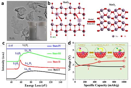 同時,經(jīng)過兩年的努力,該團隊還在相關(guān)催化機理上獲得了突破。他們在成功制備超薄三氧化鉬納米片的基礎(chǔ)上引入氧空位缺陷,在電池的測試過程中,這種富氧空位正極材料呈現(xiàn)獨特的四個獨立階段的特征。針對這四個典型的過程進行深入分析發(fā)現(xiàn),在放電過程中,這些氧空位的活性位點可以形成局部的高濃度活性氧聚集點,與鋰離子發(fā)生反應(yīng)形成穩(wěn)定的超氧化鋰類似物(Li2-xO2),當(dāng)氧空位逐漸飽和后,在Li2-xO2表面逐漸形成穩(wěn)定的Li2O2放電產(chǎn)物。充電起始階段,Li2-xO2與氧缺陷位點可以作為Li2O2分解的高效催化劑,實現(xiàn)<3.5V的低充電電壓,而超氧化鋰能夠在~3.5V的電壓平臺快速分解,有效地降低了電池的充電過電勢。該項成果不僅解釋了氧空位缺陷在Li-O2電池充放電過程中的催化機理,同時放電產(chǎn)物自催化分解現(xiàn)象的發(fā)現(xiàn)可以為未來高效正極的設(shè)計提供新的思路和解決方案。