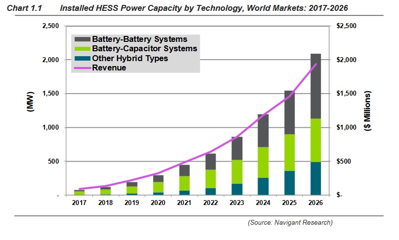 Navigant把混合系統(tǒng)定義為結(jié)合兩種及以上的互補(bǔ)操作特性的儲(chǔ)能技術(shù)的穩(wěn)定儲(chǔ)能系統(tǒng)。大多數(shù)電池系統(tǒng)是設(shè)計(jì)用于提供大功率的短脈沖,或是適應(yīng)能源密集型應(yīng)用。在應(yīng)用中使用并非最適合的儲(chǔ)能技術(shù)會(huì)導(dǎo)致效能退化和成本影響,這將最終導(dǎo)致電池充放電的安全問題。
