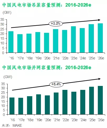 MAKE預(yù)計(jì),2017年甘肅與吉林將沒(méi)有新增并網(wǎng)容量,內(nèi)蒙、黑龍江與寧夏各省的新增并網(wǎng)容量將不足300MW;盡管海上吊裝容量預(yù)測(cè)上調(diào)194MW,仍無(wú)法抵消西北地區(qū)新增容量的大幅減少。