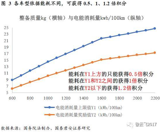 純電動乘用車車型,按整車整備質(zhì)量(m)不同,綜合工況條件下電能消耗量(Y)不滿足條件一的,車型積分按照標(biāo)準(zhǔn)車型積分的0.5倍計(jì)算,并且積分僅限自身使用;滿足條件二的,按照1.2倍計(jì)算;其余按照1倍計(jì)算。