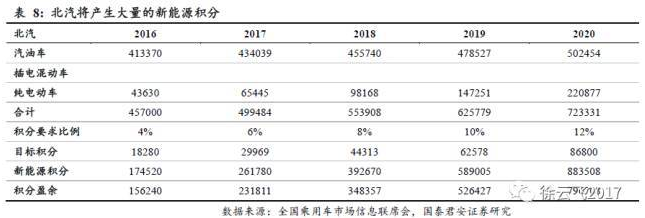 表中2016年數(shù)據(jù)來自乘聯(lián)會,汽油車按5%增速,新能源車按50%增速預(yù)測。觀察到的結(jié)果與比亞迪類似,因?yàn)橛袕?qiáng)大的新能源汽車產(chǎn)量,北汽也能產(chǎn)生相當(dāng)數(shù)額的新能源正積分。