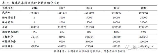 按汽油車15%的增速預(yù)測。由于長城汽車沒有新能源汽車產(chǎn)量作為支撐,所以逐漸產(chǎn)生新能源負(fù)積分。另外,因?yàn)殚L城汽車主打高油耗的SUV,2016年就以27萬的油耗負(fù)積分成為最大負(fù)積分車企。未來隨著新能源車的倍數(shù)放大效應(yīng)遞減,油耗負(fù)積分的壓力也將持續(xù)加大。目前看來,長城汽車將遭受雙積分政策嚴(yán)重的負(fù)面影響。不出意料,長城汽車將成為新能源積分交易市場的“大買家”。